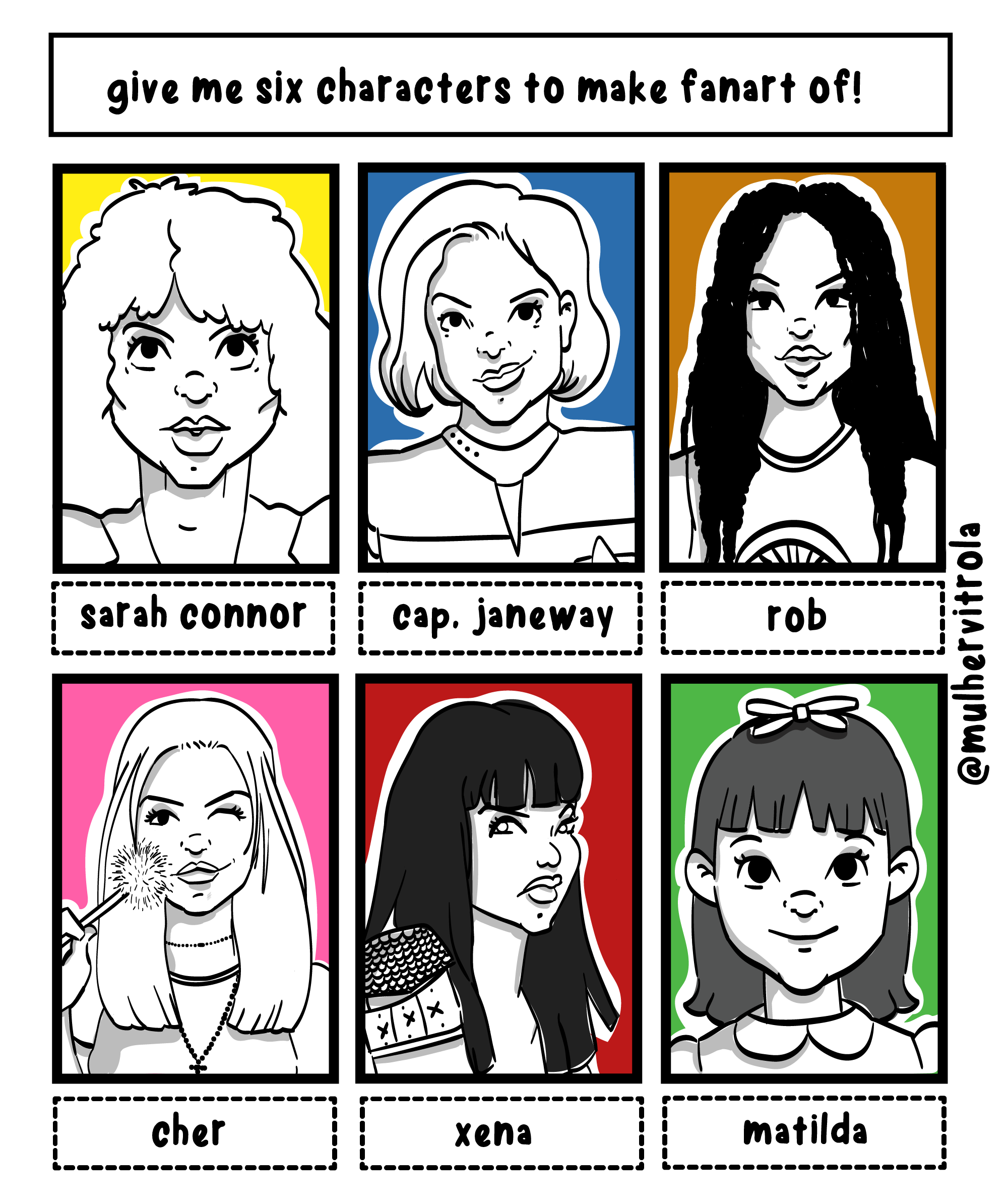 Resolvi participar de um meme que consistia na seguinte tarefa: jogar na sua rede uma imagem com 6 blocos vazios e pedir pra seus seguidores sugerirem personagens para ilustrar. Achei que seria divertido e de quebra, treinar um pouco fazendo algo diferente.