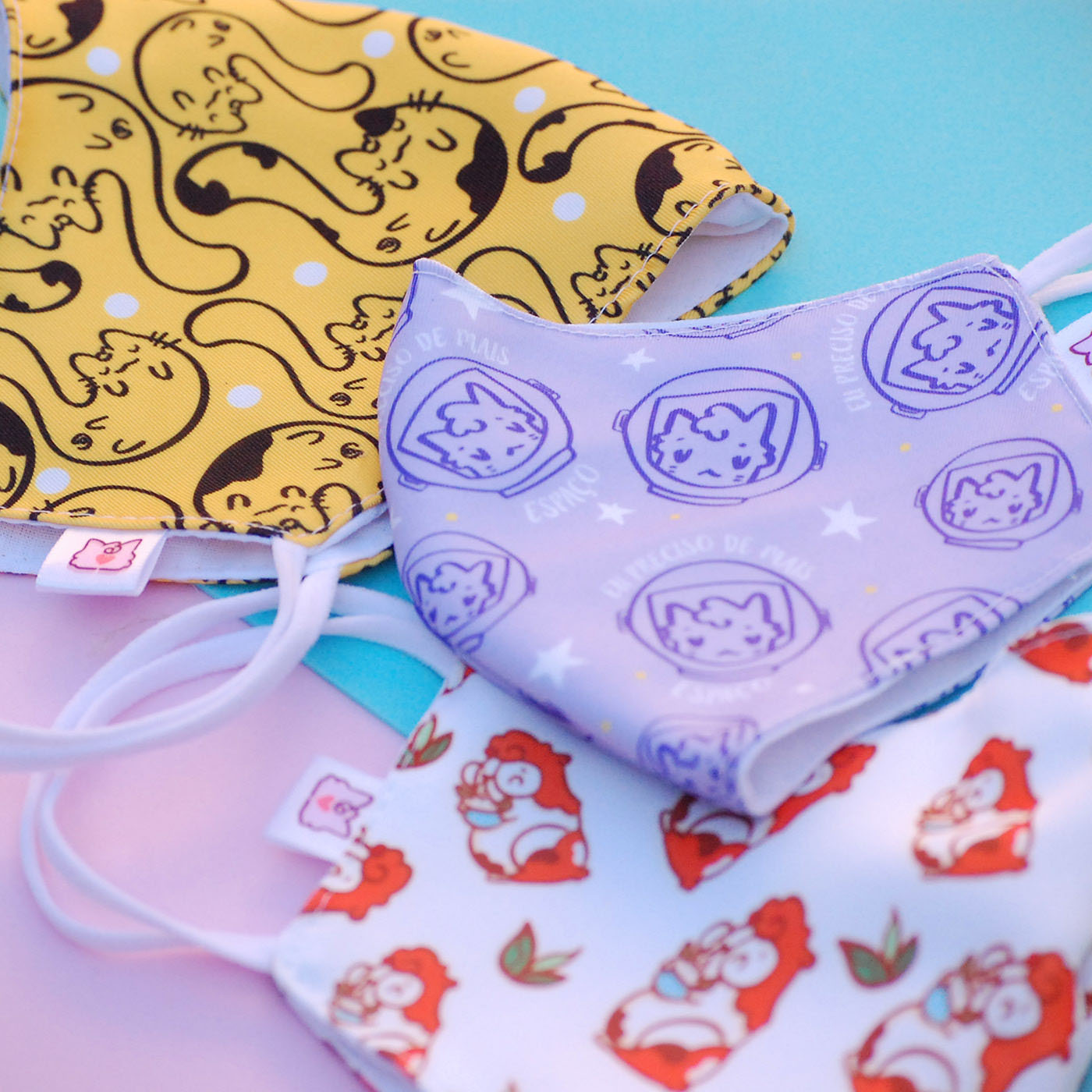 Estampas em máscaras de proteção criadas e sublimadas durante a pandemia de coronavírus em 2020.